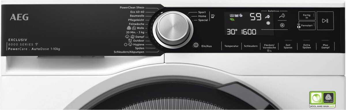 Waschmaschine, 10 kg Füllmenge, Schleuderdrehzahl U/min: maximal 1.600, Endzeitvorwahl, Nachlegefunktion, Restzeitanzeige, AutoDose (die clevere Autodosierung für Flüssigwaschmittel und Weichspüler), ProSense Technologie (Zeit-, Wasser- und Stromsparend), ProSteam Technologie (Reduzierung des Bügelaufwandes bei Hemden und Blusen, ebenso Pflege von handwaschbare Wolltextilien), Programme und Optionen DirectSpray, Eco, Outdoor/Imprägnieren, Wolle/Handwäsche, Zeitsparen, Mengenautomatik, Inverter-Motor (bürstenlos, langlebig, zuverlässig und leise), Aquacontrol System mit Alarm, Steuerung über MyAEG App möglich, kompatibel mit Google Assistant, Energieeffizienzklasse A, Go Green Vertriebskennzeichen, Breite: 59,7 cm, Höhe: 84,7 cm, Tiefe: 66 cm