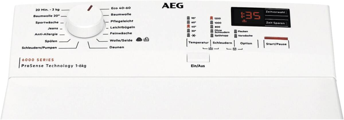 Waschmaschine, Toplader, 6 kg Füllmenge, Schleuderdrehzahl U/min: maximal 1.200, Startzeitvorwahl, Nachlegefunktion, Restzeitanzeige, ProSense Technologie (Zeit-, Wasser- und Stromsparend), Programme und Optionen Allergie, Leicht Bügeln, Daunen, Eco, Sportwäsche, Zeitsparen, Mengenautomatik, Inverter-Motor (bürstenlos, langlebig, zuverlässig und leise), Aquacontrol System mit Alarm – Vollwasserschutz, auf Rollen fahrbar, Energieeffizienzklasse B, Europa, Breite: 39,7 cm, Höhe: 90,3 cm, Tiefe: 59,9 cm
