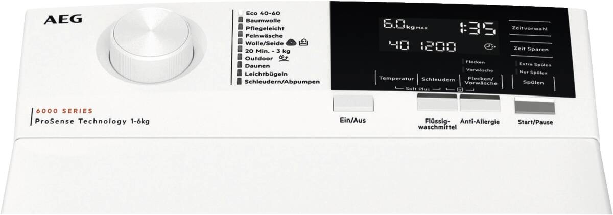 Waschmaschine, Toplader, 6 kg Füllmenge, Schleuderdrehzahl U/min: maximal 1.200, Startzeitvorwahl, Nachlegefunktion, LED-Display, Programmablaufanzeige, Restzeitanzeige, ProSense Technologie (Zeit-, Wasser- und Stromsparend), Programme und Optionen Allergie, Leicht Bügeln, Daunen, Eco, Flecken, Outdoor/Imprägnieren, SoftPlus (bessere Weichspülerverteilung für ein weiches Tragegefühl auf der Haut), Zeitsparen, Mengenautomatik, Inverter-Motor (bürstenlos, langlebig, zuverlässig und leise), Aquacontrol System mit Alarm – Vollwasserschutz, auf Rollen fahrbar, Energieeffizienzklasse A, Go Green Vertriebskennzeichen, Europa, Breite: 39,7 cm, Höhe: 90,3 cm, Tiefe: 59,9 cm