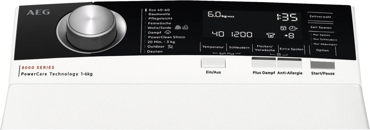 Die AEG Waschmaschine bietet zudem eine Vielzahl an Programmen und Optionen wie 20min-3 kg, Allergie, Auffrischen, Baumwolle, Daunen, Eco, Feinwäsche, Flecken, Knitterschutz, Outdoor/Imprägnieren, Pflegeleicht, PowerClean 59 Min., SoftPlus, Wolle/Seide und Zeitsparen. Damit sind Sie für jede Wäsche bestens gerüstet.