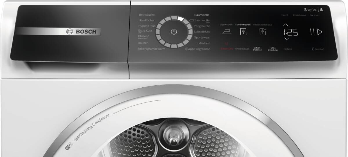| selbstreinigender Kondensator (automatische Flusenentfernung bei jedem Trockengang für konstant niedrigen Energieverbrauch) |