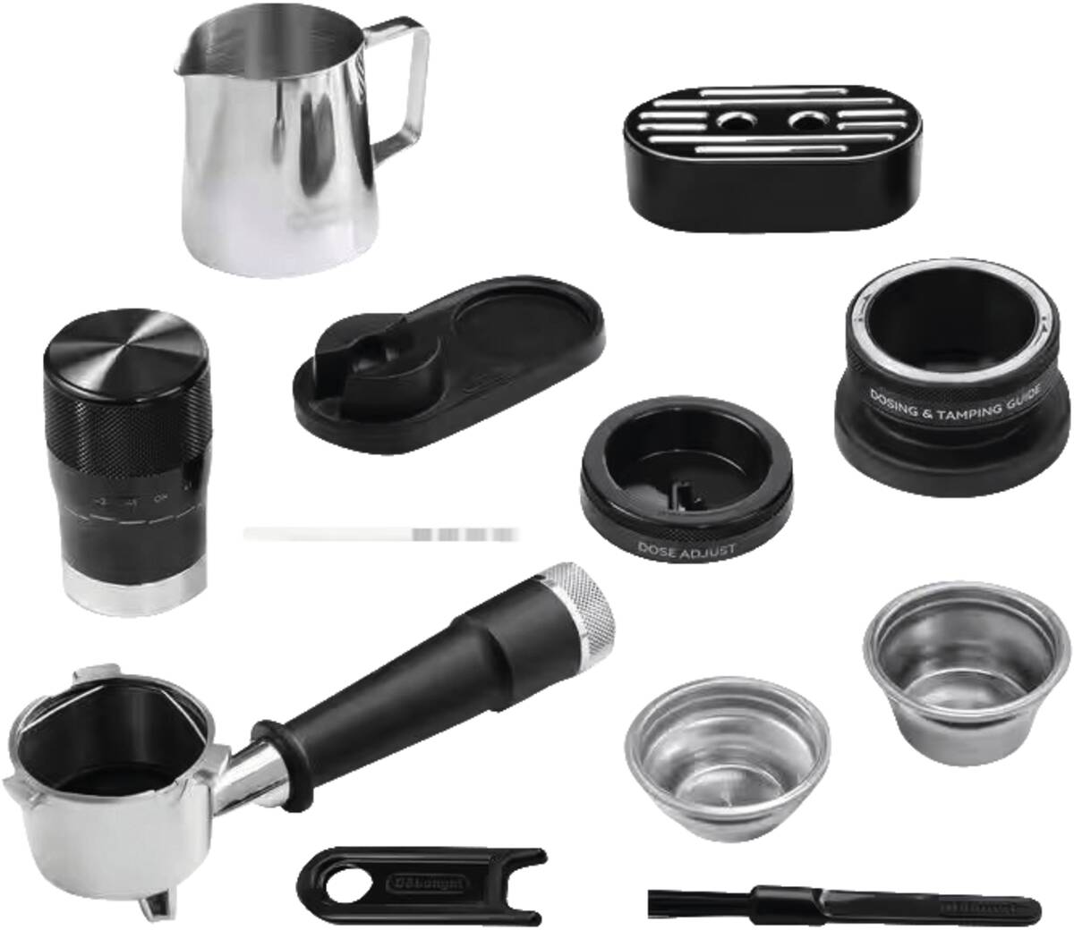 Espresso-Maschine, Siebträger, 15 bar Pumpendruck, Thermoblocksystem, 1 und 2 Tassenbetrieb, verstellbares Mahlwerk, 1,7 l Wassertank, abnehmbar, Display, automatische Abschaltung, Cold Brew Verfahren, Aufschäumdüse, Heißwasser-/Dampfdüse, Milchkännchen