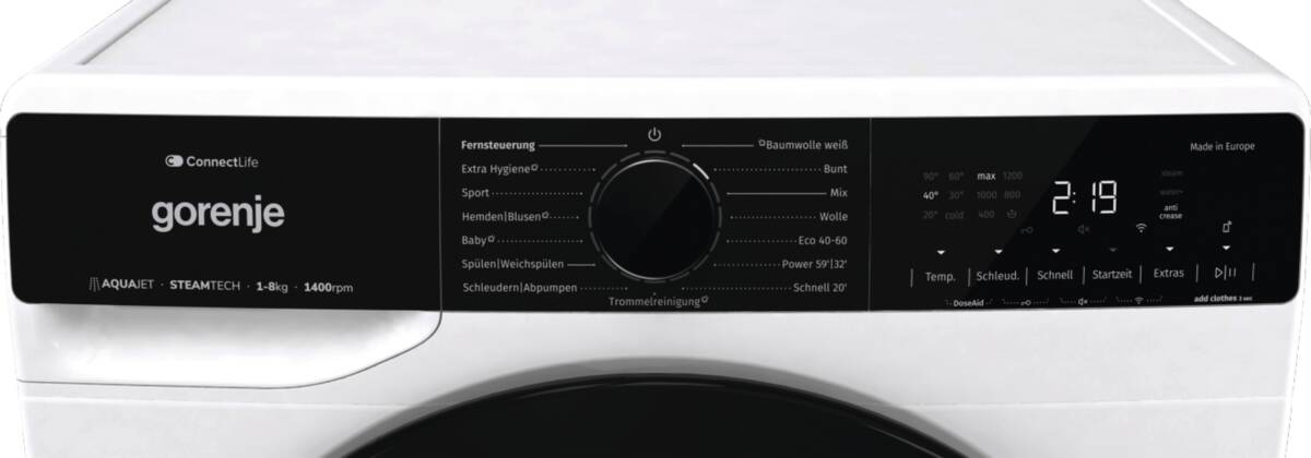 Waschmaschine, 8 kg Füllmenge, Schleuderdrehzahl U/min: maximal 1.400, Endzeitvorwahl, Favoritenspeicher, Nachlegefunktion, LED-Display, Programme und Optionen Babykleidung, Leicht Bügeln, Dampf-Funktion, Kalt, Selbstreinigung, Sportwäsche, T-Shirts, PowerDrive-Motor (bürstenlos, kraftvoll und zuverlässig), Totaler Aqua Stop, ConnectLife-AppliancesDashboar, per App steuerbar, Energieeffizienzklasse A, Go Green Vertriebskennzeichen, Breite: 60 cm, Höhe: 85 cm, Tiefe: 46,5 cm