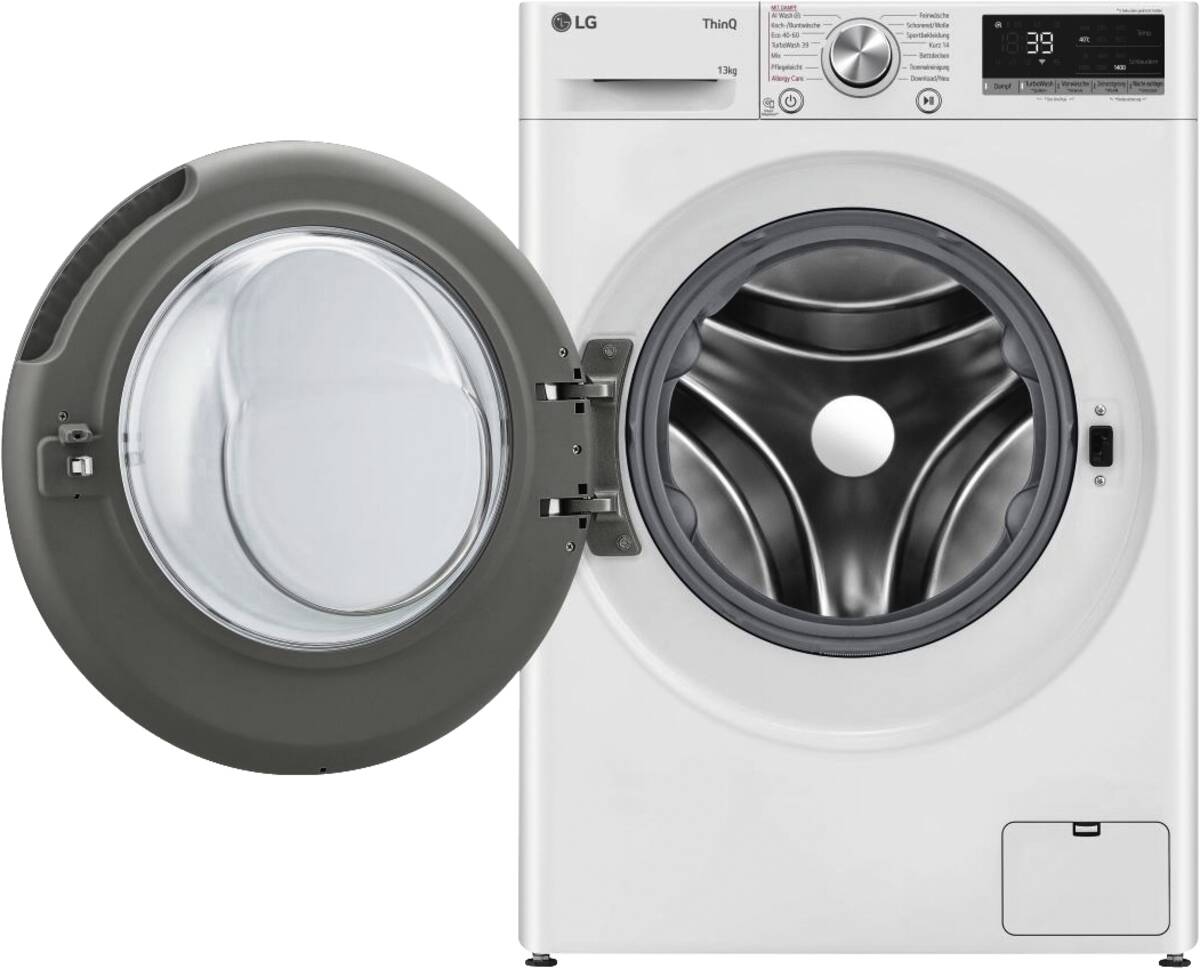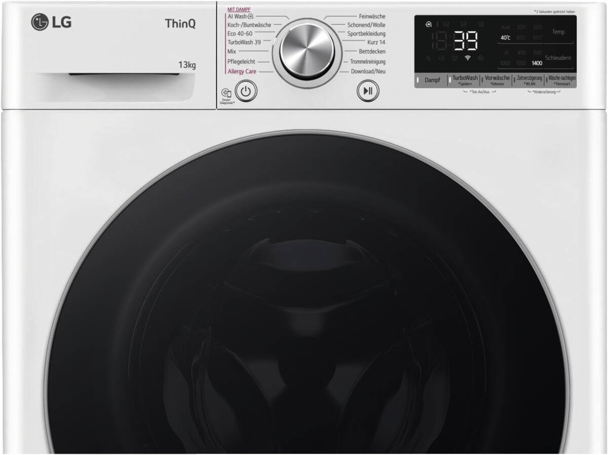 Waschmaschine, 13 kg Füllmenge, Schleuderdrehzahl U/min: maximal 1.400, Touch-Control-Bedienung, Startzeitvorwahl, Nachlegefunktion, Display, Programmablaufanzeige, Restzeitanzeige, Programme und Optionen Bettdecken, Dampf-Funktion, Eco, Kalt, Sportwäsche, Spülen plus, Trommelreinigung, Mengenautomatik, LG ThinQ, per App steuerbar, Energieeffizienzklasse A, Breite: 60 cm, Höhe: 85 cm, Tiefe: 61,5 cm