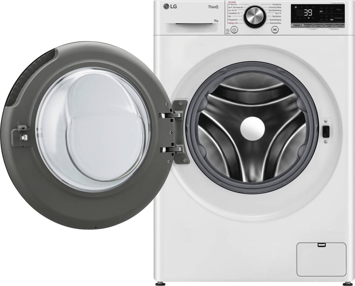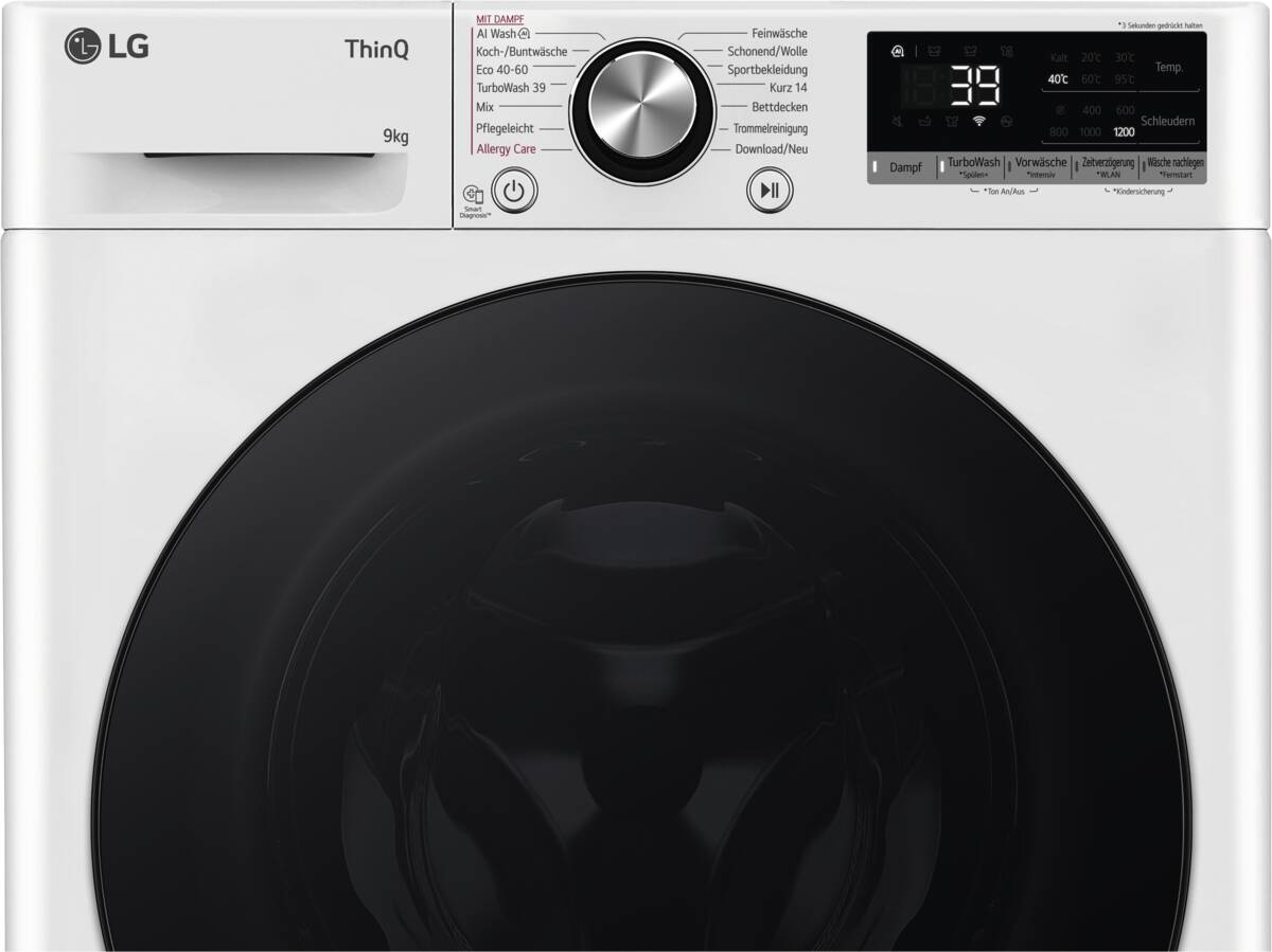 Waschmaschine, 9 kg Füllmenge, Schleuderdrehzahl U/min: maximal 1.200, Startzeitvorwahl, Nachlegefunktion, Display, Restzeitanzeige, AI DD-Technologie (Einstellung des optimalen Waschgangs nach Gewicht der Wäsche und Empfindlichkeit des Stoffes), Programme und Optionen Bettdecken, Dampf-Programm, Eco, Kalt, Sportwäsche, Trommelreinigung, Inverter Direct Drive, Aqua Lock Vollwasserschutz, LG ThinQ, per App steuerbar, Energieeffizienzklasse A, Go Green Vertriebskennzeichen, Breite: 60 cm, Höhe: 85 cm, Tiefe: 53,5 cm