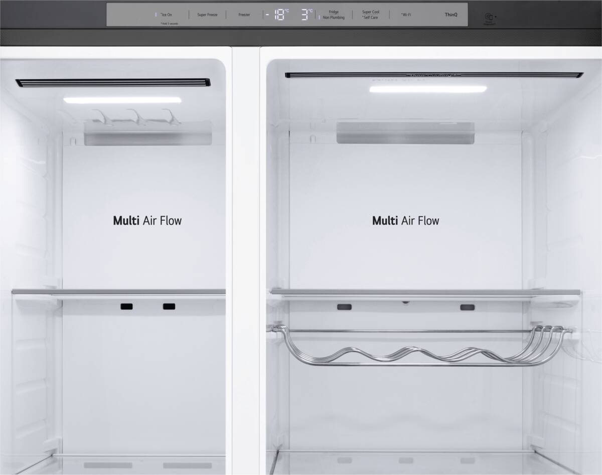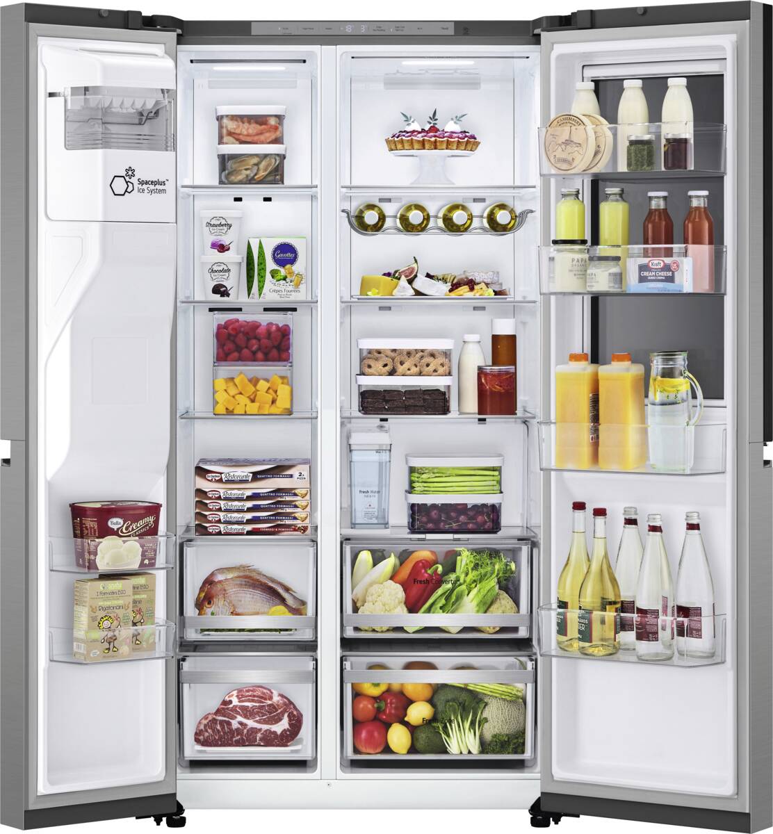 Side by Side, Rauminhalt Kühlen: 407 l, MultiAirflow, Door-in-Door (erleichtert den schnellen Zugriff auf häufig benötigte Lebensmittel und Getränke), InstaView (verfügt über eine elegante Glasscheibe, die durch zweimaliges, leichtes Klopfen beleuchtet wird, so wird ein Blick in den Kühlschrank, ohne dass die Tür geöffnet werden muss), Glasablageflächen: 4, Obst-/Gemüsebehälter: 2, LinearCooling (präzise Temperaturregelung, der die Temperaturschwankungen innerhalb des Kühlschranks auf ±0,5°C reduziert), Door Cooling+ (durch die zusätzliche Luftöffnung oben im vorderen Bereich wir der komplette Kühlschrank viel schneller und gleichmäß iger gekühlt, kühlt den Türbereich ca. 32% schneller), LED-Beleuchtung, Rauminhalt Gefrieren: 221 l, Glasablageflächen: 4, Schubladen: 2, NoFrost, Super-Gefrieren, LED-Beleuchtung, Eisbereiter für Eiswürfel, Crushed Ice, digitale Temperaturanzeige, außen, Wasserspender, LG ThinQ, per App steuerbar, Energieeffizienzklasse D, Breite: 91,3 cm, Höhe: 179 cm, Tiefe: 73,5 cm