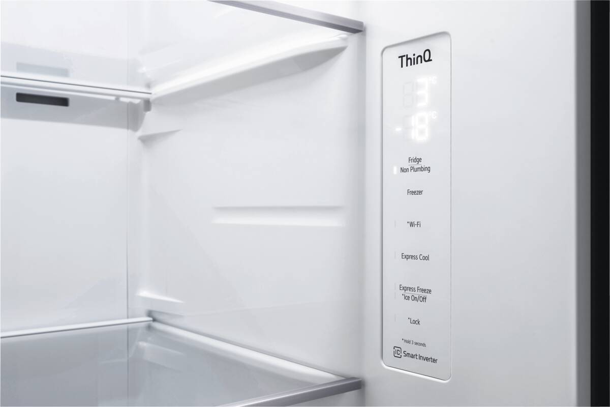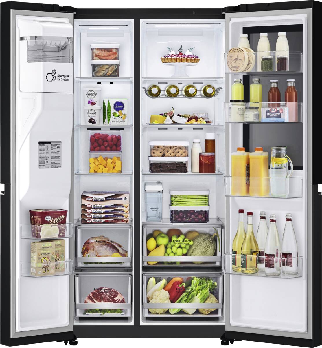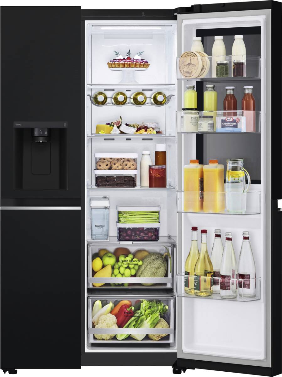 Side by Side, Rauminhalt Kühlen: 416 l, MultiAirflow, InstaView (verfügt über eine elegante Glasscheibe, die durch zweimaliges, leichtes Klopfen beleuchtet wird, so wird ein Blick in den Kühlschrank, ohne dass die Tür geöffnet werden muss), Flaschenablage (liegend), Glasablageflächen: 4, Obst-/Gemüsebehälter: 2, LinearCooling (präzise Temperaturregelung, der die Temperaturschwankungen innerhalb des Kühlschranks auf ±0,5°C reduziert), FRESH Balancer, Moist Balance Crisper, LED-Beleuchtung, Rauminhalt Gefrieren: 219 l, Glasablageflächen: 4, Schubladen: 2, NoFrost, Super-Gefrieren, LED-Beleuchtung, Eisbereiter für Eiswürfel, Crushed Ice, Wasserspender, LG ThinQ, Energieeffizienzklasse E, Breite: 91,3 cm, Höhe: 179 cm, Tiefe: 73,5 cm