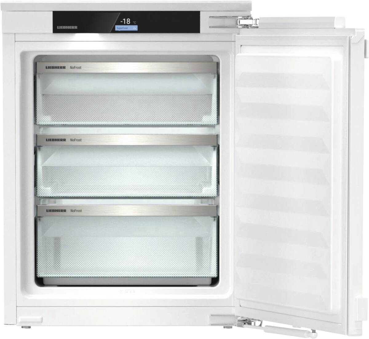 Einbau-Gefrierschrank, Festtürmontage, 66 l Rauminhalt, Schubladen: 3, Super-Gefrieren, NoFrost, Display, farbig, 2,4 Zoll, 6,1 cm, Touch-Funktion, digitale Temperaturanzeige, VarioSpace (einzelne Gefrierschubfächer herausnehmbar, für extra hohen Stauraum), SmartDevice integriert (Steuerung über Internetverbindung möglich), per App unterstützter Datentransfer, per App steuerbar, Energieeffizienzklasse B, Go Green Vertriebskennzeichen, Made in Germany, Breite: 55,9 cm, Höhe: 71,2 cm, Tiefe: 54,6 cm