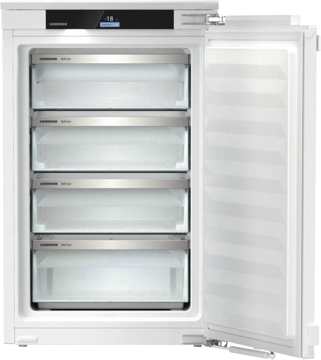 Einbau-Gefrierschrank, Festtürmontage, 87 l Rauminhalt, Schubladen: 4, Super-Gefrieren, NoFrost, Display, farbig, 2,4 Zoll, 6,1 cm, Touch-Funktion, digitale Temperaturanzeige, VarioSpace (einzelne Gefrierschubfächer herausnehmbar, für extra hohen Stauraum), SmartDevice integriert (Steuerung über Internetverbindung möglich), per App unterstützter Datentransfer, per App steuerbar, Energieeffizienzklasse C, Made in Germany, Breite: 55,9 cm, Höhe: 87,2 cm, Tiefe: 54,6 cm