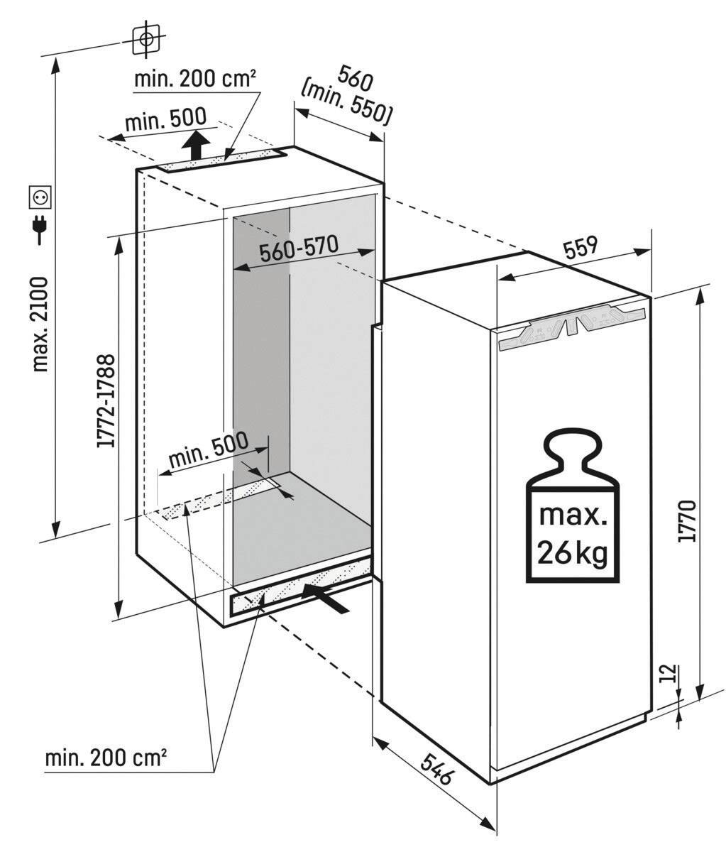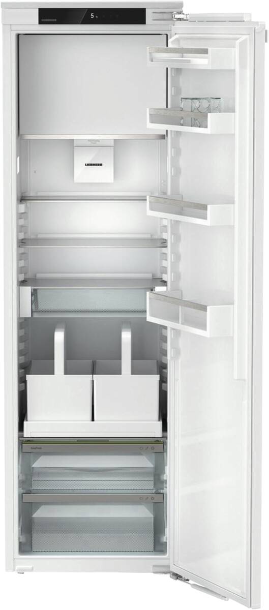 Einbau-Kühlschrank, integrierbar, Festtürmontage, Rauminhalt Kühlen: 259 l, Rauminhalt Gefrieren: 27 l, Super-Kühlen, Flaschenkorb mit Auszug, Frische-Behälter: 1, Glasablageflächen: 3, Obst-/Gemüsebehälter: 1, VarioSafe (Kleinere Lebensmittel, Packungen, Tuben und Gläser sind in diesem Schubfach optimal aufbewahrt), LED-Beleuchtung, Display, Touch-Funktion, digitale Temperaturanzeige, SmartDevice integriert (Steuerung über Internetverbindung möglich), per App unterstützter Datentransfer, per App steuerbar, Energieeffizienzklasse D, Made in Germany, Breite: 55,9 cm, Höhe: 177 cm, Tiefe: 54,6 cm