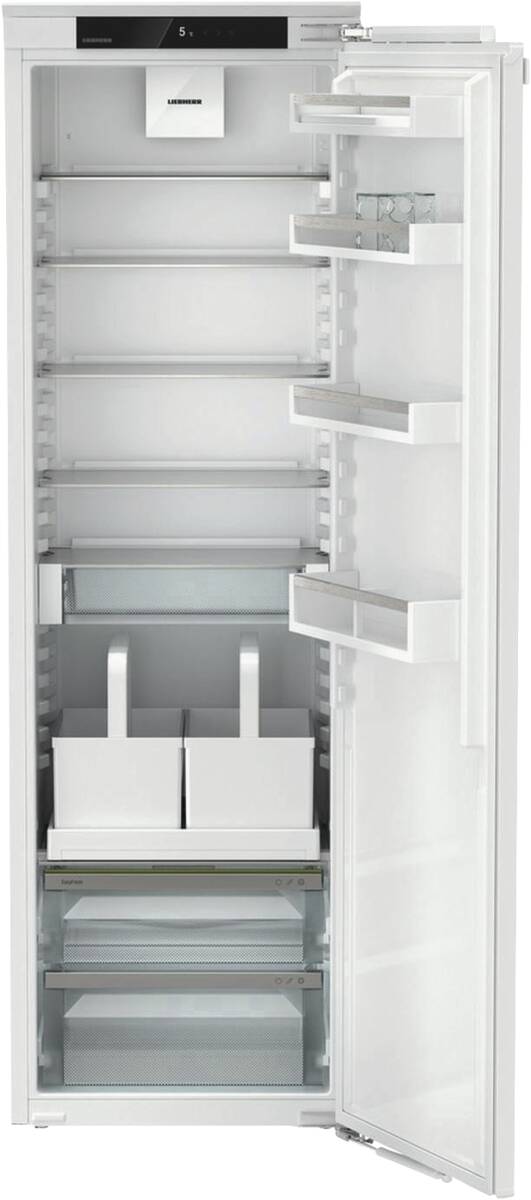 Einbau-Kühlschrank, Vollraum, integrierbar, Festtürmontage, Rauminhalt Kühlen: 309 l, Super-Kühlen, Flaschenkorb mit Auszug, Frische-Behälter: 1, Glasablageflächen: 5, Obst-/Gemüsebehälter: 1, VarioSafe (Kleinere Lebensmittel, Packungen, Tuben und Gläser sind in diesem Schubfach optimal aufbewahrt), LED-Beleuchtung, Display, Touch-Funktion, digitale Temperaturanzeige, SmartDevice integriert (Steuerung über Internetverbindung möglich), per App unterstützter Datentransfer, per App steuerbar, Energieeffizienzklasse D, Made in Germany, Breite: 55,9 cm, Höhe: 177 cm, Tiefe: 54,6 cm