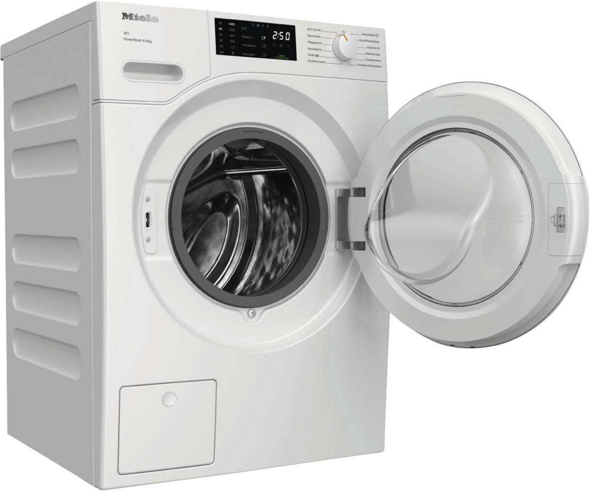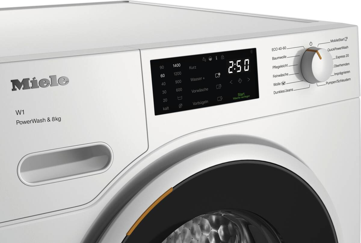 Waschmaschine, 5° geneigte Blende, 8 kg Füllmenge, Schleuderdrehzahl U/min: maximal 1.400, Schontrommel, Startzeitvorwahl, AddLoad (Nachlegefunktion), Display, Restzeitanzeige, AutoClean-Einspülkasten (selbstreinigende Waschmittelschublade), CapDosing (Einfache Dosierung von Spezialwaschmittel, Weichspüler und Additiv mit Portionskapseln), PowerWash (Höchste Waschleistung und Schnelligkeit kombiniert mit höchster Energieeffizienz), Programme und Optionen Vorbügeln mit Dampf, Eco, Imprägnieren, Niedrigtemperaturwaschen, Wolle/Handwäsche, Mengenautomatik, Profi Eco-Motor (bürstenlos, sparsam, leistungsstark und verschleißfrei), Watercontrol-System, Miele@home (vorbereitet für die Heimvernetzung), PIN-Code Verriegelung, per App unterstützter Datentransfer, per App steuerbar, kompatibel mit Amazon Alexa, Energieeffizienzklasse A, Go Green Vertriebskennzeichen, Breite: 59,6 cm, Höhe: 85 cm, Tiefe: 64,3 cm