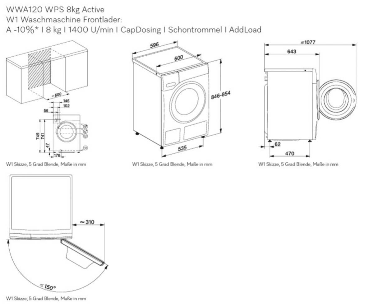 Waschmaschine, 5° geneigte Blende, 8 kg Füllmenge, Schleuderdrehzahl U/min: maximal 1.400, Schontrommel, 10 Waschprogramme, Startzeitvorwahl, AddLoad (Nachlegefunktion), LCD-Display, Restzeitanzeige, AutoClean-Einspülkasten (selbstreinigende Waschmittelschublade), CapDosing (Einfache Dosierung von Spezialwaschmittel, Weichspüler und Additiv mit Portionskapseln), Programme und Optionen Eco, Imprägnieren, Kalt, Outdoor, Mengenautomatik, Profi Eco-Motor (bürstenlos, sparsam, leistungsstark und verschleißfrei), Waterproof-System, PIN-Code Verriegelung, Energieeffizienzklasse A, Go Green Vertriebskennzeichen, Breite: 59,6 cm, Höhe: 85 cm, Tiefe: 64,3 cm