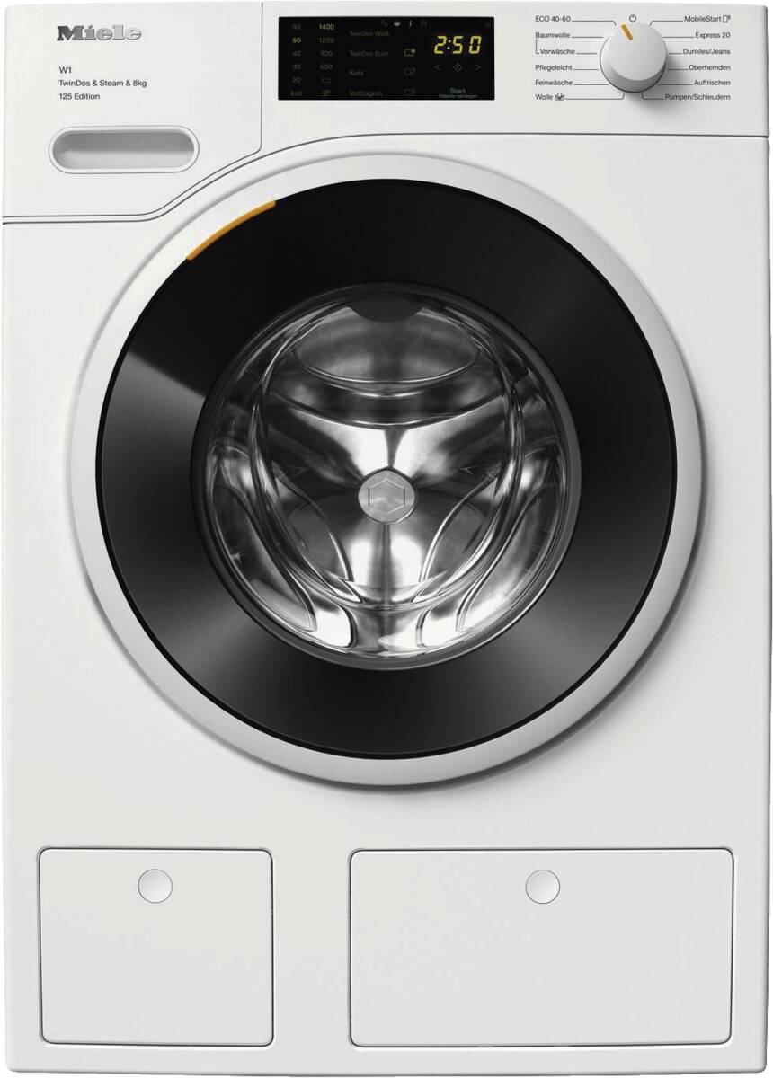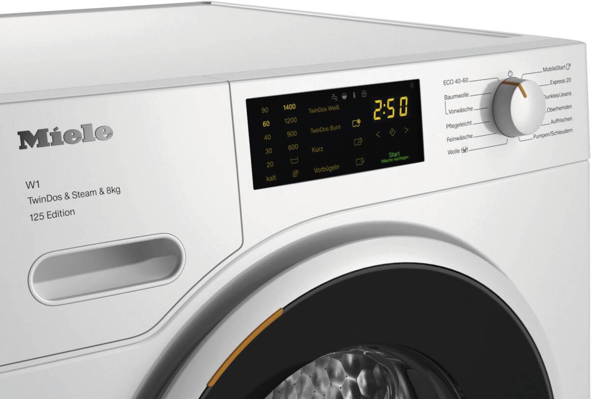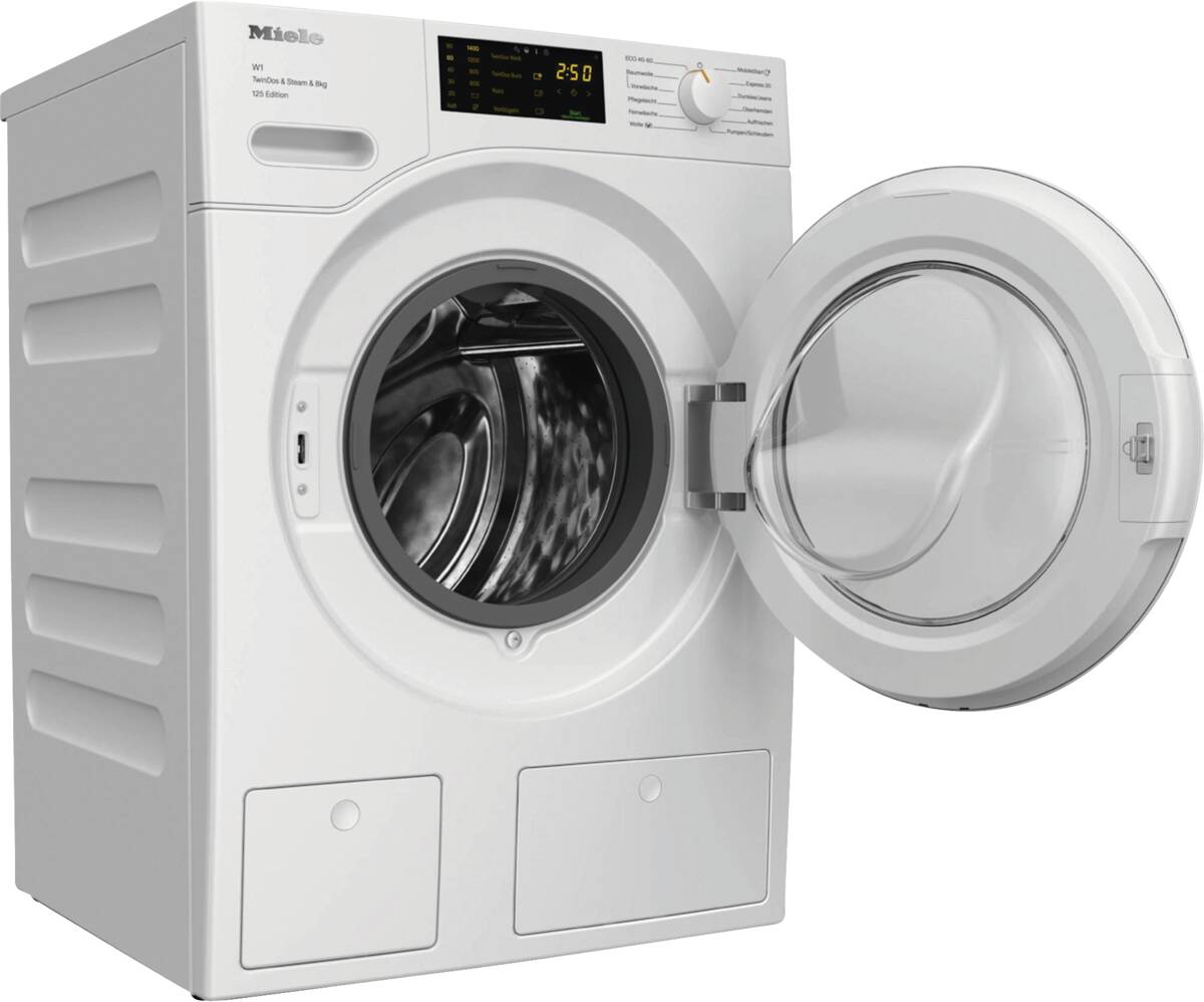 Waschmaschine, 5° geneigte Blende, 8 kg Füllmenge, Schleuderdrehzahl U/min: maximal 1.400, Schontrommel, Display, CapDosing (Einfache Dosierung von Spezialwaschmittel, Weichspüler und Additiv mit Portionskapseln), TwinDos (automatische Dosierung mit 2-Phasen-System), Programme und Optionen Vorbügeln, Dampfglätten, Eco, Niedrigtemperaturwaschen, Wolle/Handwäsche, Profi Eco-Motor (bürstenlos, sparsam, leistungsstark und verschleißfrei), Watercontrol-System, Miele@home (vorbereitet für die Heimvernetzung), PIN-Code Verriegelung, per App unterstützter Datentransfer, per App steuerbar, kompatibel mit Amazon Alexa, Energieeffizienzklasse A, Go Green Vertriebskennzeichen, Breite: 59,6 cm, Höhe: 85 cm, Tiefe: 63,6 cm