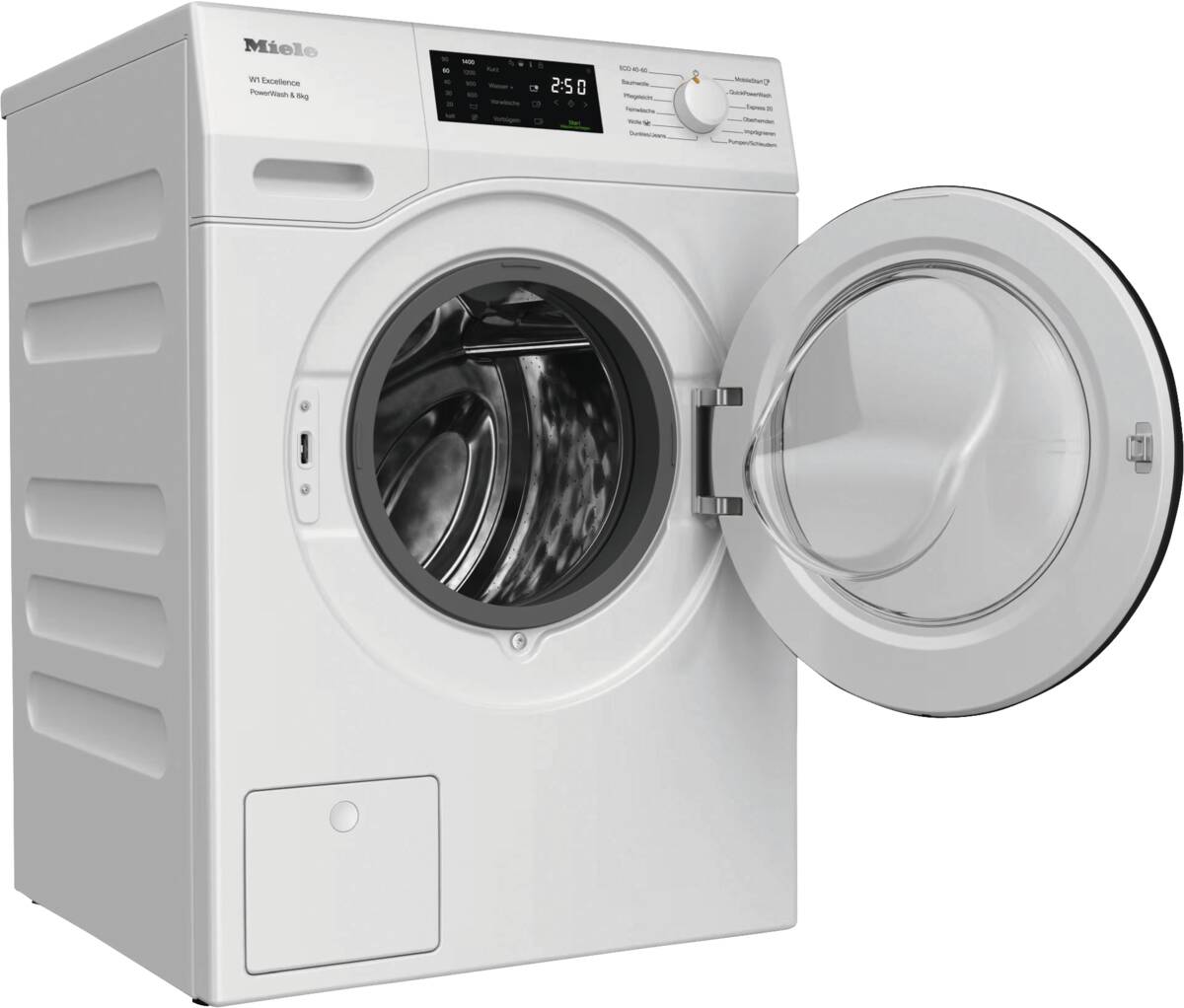 Waschmaschine, schräge Blende, 8 kg Füllmenge, Schleuderdrehzahl U/min: maximal 1.400, Schontrommel, 10 Waschprogramme, Startzeitvorwahl, AddLoad (Nachlegefunktion), LCD-Display, Restzeitanzeige, AutoClean-Einspülkasten (selbstreinigende Waschmittelschublade), CapDosing (Einfache Dosierung von Spezialwaschmittel, Weichspüler und Additiv mit Portionskapseln), PowerWash (Höchste Waschleistung und Schnelligkeit kombiniert mit höchster Energieeffizienz), Programme und Optionen Eco, Imprägnieren, Kalt, Wolle/Handwäsche, Mengenautomatik, Profi Eco-Motor (bürstenlos, sparsam, leistungsstark und verschleißfrei), Waterproof-System, Miele@home (vorbereitet für die Heimvernetzung), PIN-Code Verriegelung, Energieeffizienzklasse A, Go Green Vertriebskennzeichen, Breite: 59,6 cm, Höhe: 85 cm, Tiefe: 63,6 cm