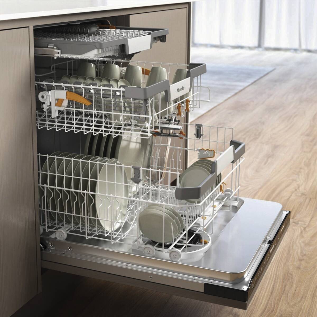 Einbau-Geschirrspüler, vollintegrierbar, Startzeitvorwahl, AutoDos (Automatische Dosierung von Reinigungsmittel für optimale Reinigungsergebnisse und höchsten Komfort), Display, Klartextanzeige im Display, Restzeitanzeige, Eco Feedback (Anzeige des vorraussichtlichen Wasser- und Stromverbrauchs), Sieb-Kontrollanzeige, Oberkorb höhenverstellbar, Besteckschublade, 3D-MultiFlex, EcoPower-Technologie (Innovative Wasserführung für wassersparendes Spülen), AutoOpen-Trocknung (automatisches Öffnen der Tür nach dem Programmende), ComfortClose (die Tür lässt sich besonders leicht öffnen und schließen und bleibt in der gewünschten Position stehen), Waterproof-System, Warmwasseranschluß, Miele@home (vorbereitet für die Heimvernetzung), per App unterstützter Datentransfer, per App steuerbar, kompatibel mit Amazon Alexa, Energieeffizienzklasse A, Go Green Vertriebskennzeichen, Breite: 59,8 cm, Höhe: 80,5 cm, Tiefe: 55 cm
