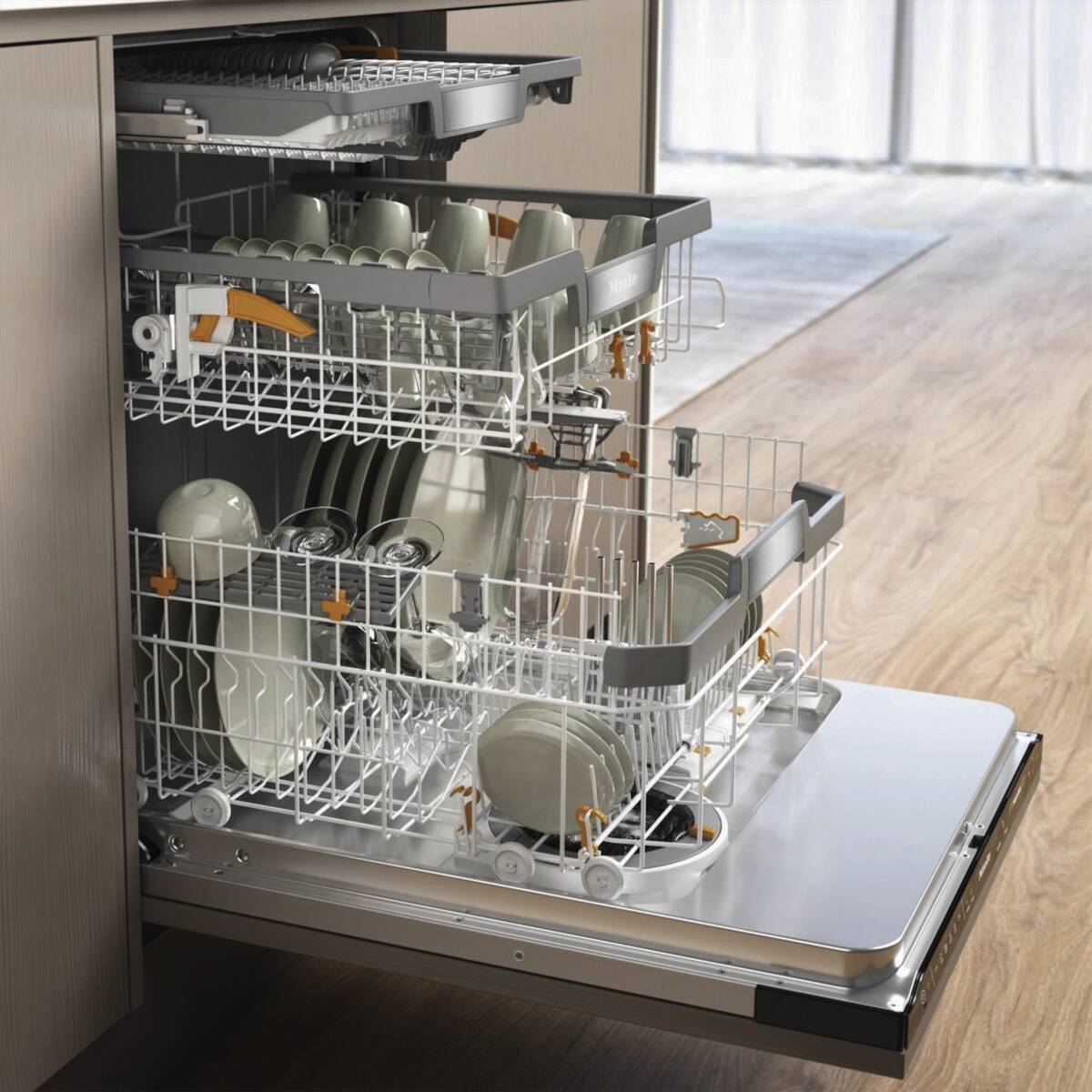 Einbau-Geschirrspüler, XXL-Format, Startzeitvorwahl, AutoDos (Automatische Dosierung von Reinigungsmittel für optimale Reinigungsergebnisse und höchsten Komfort), Display, Klartextanzeige im Display, Restzeitanzeige, Eco Feedback (Anzeige des vorraussichtlichen Wasser- und Stromverbrauchs), Sieb-Kontrollanzeige, Oberkorb höhenverstellbar, Besteckschublade, 3D-MultiFlex, EcoPower-Technologie (Innovative Wasserführung für wassersparendes Spülen), AutoOpen-Trocknung (automatisches Öffnen der Tür nach dem Programmende), ComfortClose (die Tür lässt sich besonders leicht öffnen und schließen und bleibt in der gewünschten Position stehen), Waterproof-System, Warmwasseranschluß, Miele@home (vorbereitet für die Heimvernetzung), per App unterstützter Datentransfer, per App steuerbar, kompatibel mit Amazon Alexa, Energieeffizienzklasse A, Go Green Vertriebskennzeichen, Breite: 59,8 cm, Höhe: 84,5 cm, Tiefe: 55 cm