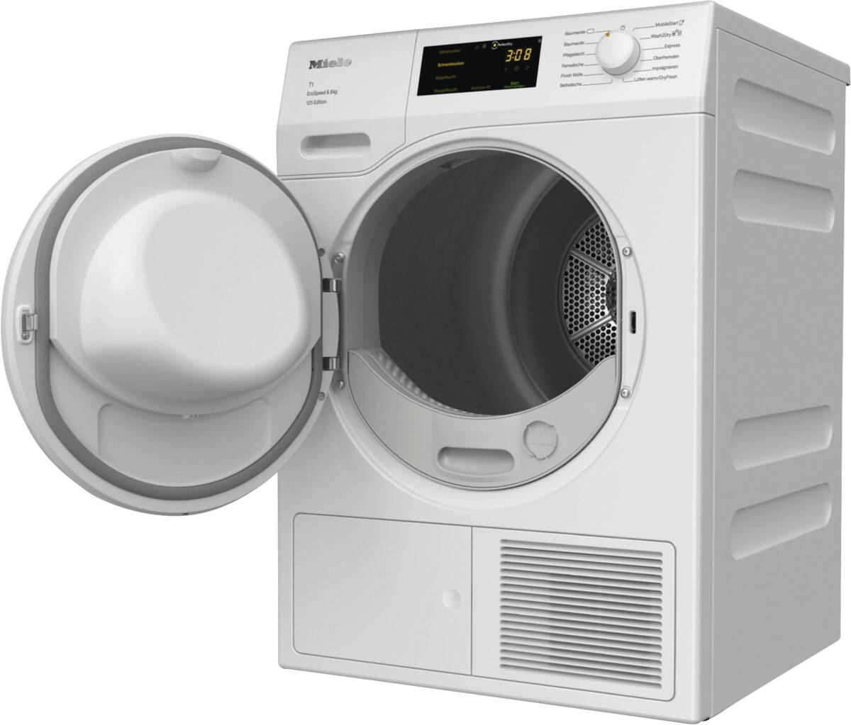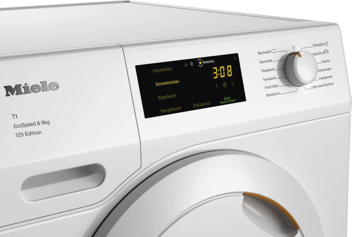Wärmepumpentrockner, schräge Blende, 8 kg Füllmenge, Schontrommel, Startzeitvorwahl, AddLoad (Nachlegefunktion), Display, Restzeitanzeige, EcoDry-Technologie, FraganceDos (duftende Wäsche mit optionalem Duftflakon), Imprägnieren, Knitterschutz, PerfectDry (punktgenaue Trocknung dank Kalksensorik), Finish Wolle, LED-Trommelinnenbeleuchtung, wartungsfreier Wärmetauscher (keine manuelle Reinigung mehr notwendig), Kondenswasserableitung, Miele@home (vorbereitet für die Heimvernetzung), Wash2Dry (die Waschmaschine sendet nach dem Waschvorgang die Programmdaten an den Trockner, dieser wählt automatisch das passende Tr ockenprogramm), PIN-Code Verriegelung, per App unterstützter Datentransfer, per App steuerbar, kompatibel mit Amazon Alexa, Energieeffizienzklasse C, Energieeffizienzklasse A, Geräuschemmissiosklasse B, Breite: 59,6 cm, Höhe: 85 cm, Tiefe: 64 cm