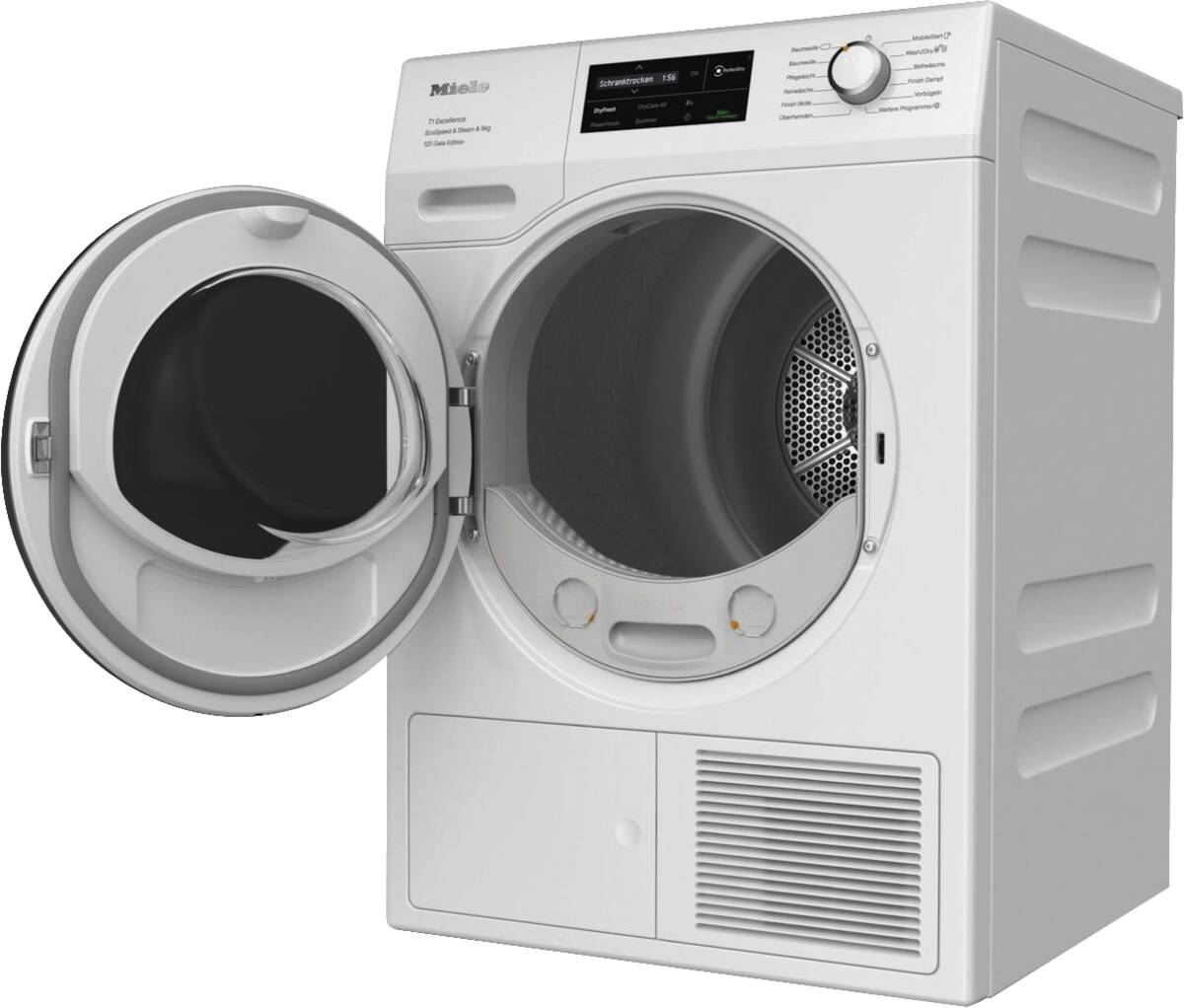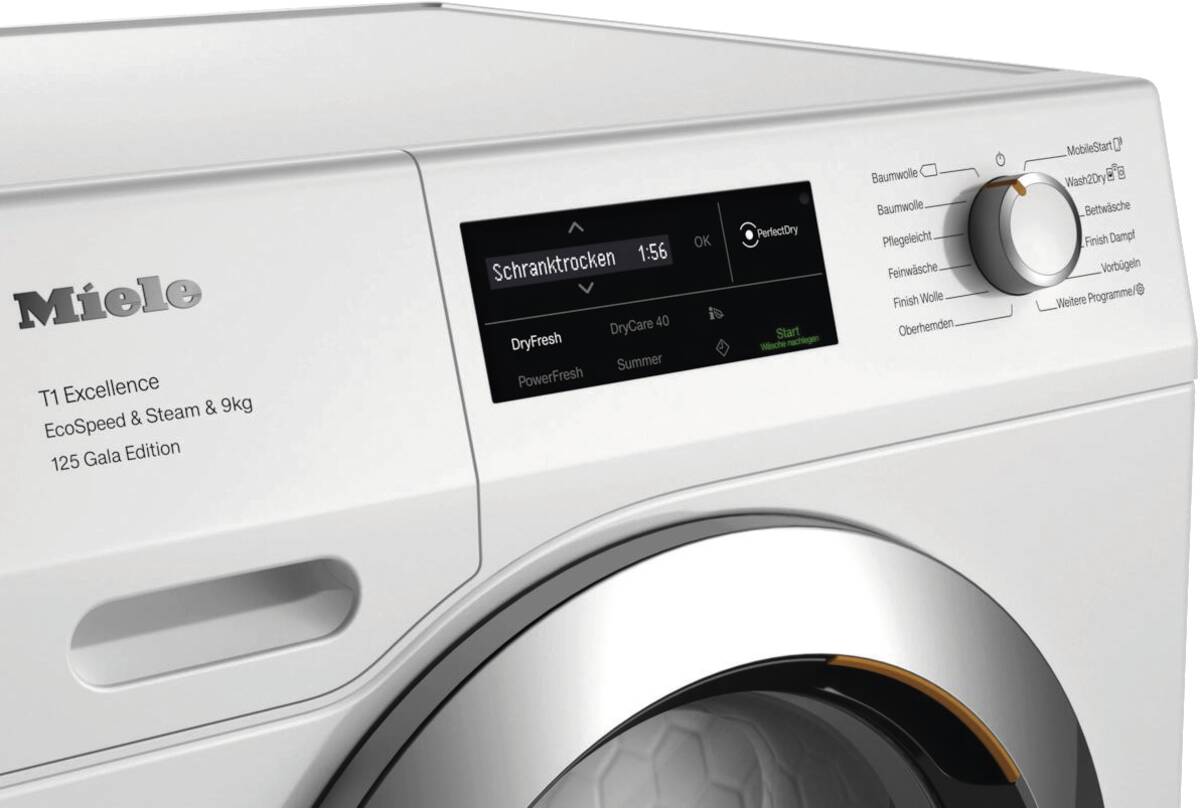 Wärmepumpentrockner, schräge Blende, 9 kg Füllmenge, SilenceDrum-Trommelsystem, Startzeitvorwahl, AddLoad (Nachlegefunktion), Display, Klartextanzeige im Display, Wahl der Displaysprache möglich, Restzeitanzeige, EcoFeedback (Anzeige von Energieverbrauch und Flusenfilterzustand), EcoDry-Technologie, FraganceDos2 (duftende Wäsche mit optionalem Duftflakon, es können zwei Düfte, zur Auswahl, eingesetzt werden), Imprägnieren, Knitterschutz, Kopfkissen, Outdoor, PerfectDry (punktgenaue Trocknung dank Kalksensorik), Finish Seide, Sportwäsche, Finish Wolle, LED-Trommelinnenbeleuchtung, wartungsfreier Wärmetauscher (keine manuelle Reinigung mehr notwendig), Kondenswasserableitung, Miele@home (vorbereitet für die Heimvernetzung), Wash2Dry (die Waschmaschine sendet nach dem Waschvorgang die Programmdaten an den Trockner, dieser wählt automatisch das passende Tr ockenprogramm), PIN-Code Verriegelung, per App unterstützter Datentransfer, per App steuerbar, kompatibel mit Amazon Alexa, Energieeffizienzklasse C, Breite: 59,6 cm, Höhe: 85 cm, Tiefe: 63,6 cm