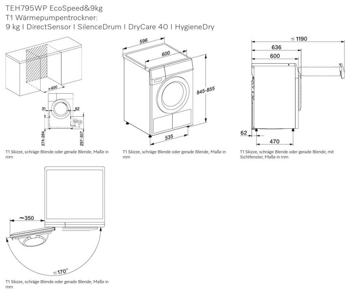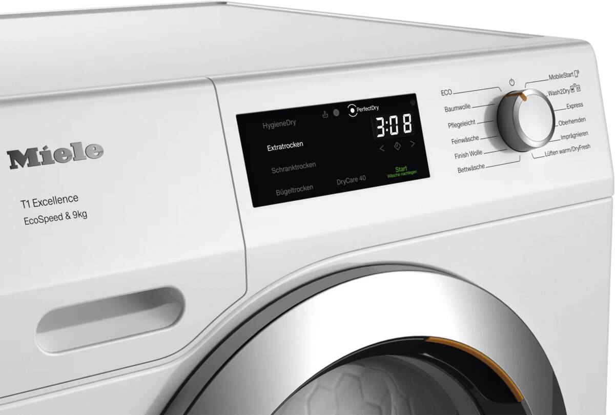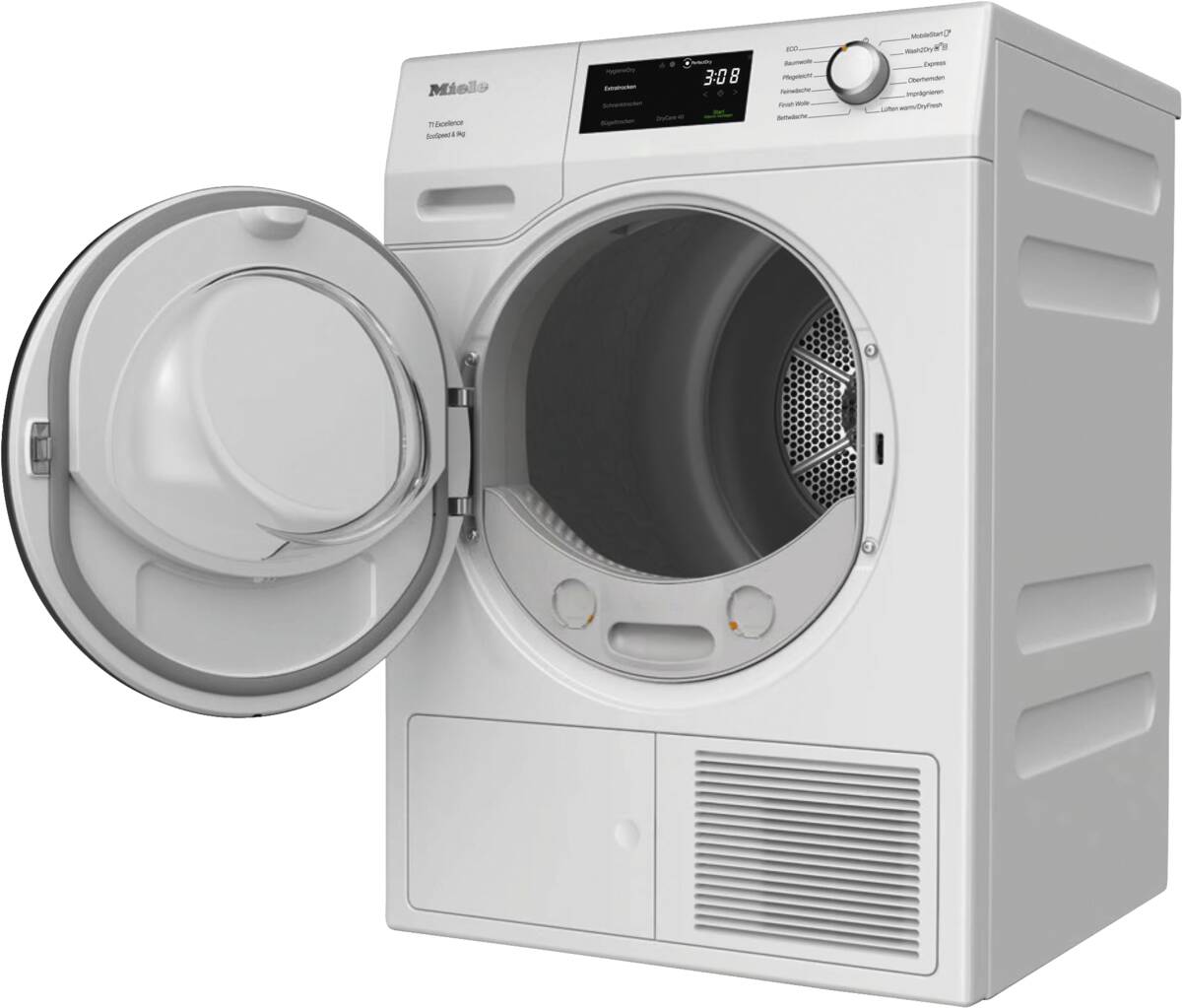 Wärmepumpentrockner, schräge Blende, 9 kg Füllmenge, SilenceDrum-Trommelsystem, 11 Programme, Startzeitvorwahl, AddLoad (Nachlegefunktion), LCD-Display, Restzeitanzeige, EcoDry-Technologie, Eco, FraganceDos (duftende Wäsche mit optionalem Duftflakon), Imprägnieren, Finish Wolle, LED-Trommelinnenbeleuchtung, wartungsfreier Wärmetauscher (keine manuelle Reinigung mehr notwendig), Miele@home (vorbereitet für die Heimvernetzung), Wash2Dry (die Waschmaschine sendet nach dem Waschvorgang die Programmdaten an den Trockner, dieser wählt automatisch das passende Tr ockenprogramm), PIN-Code Verriegelung, Kondenswasser-Ablaufschlauch, Energieeffizienzklasse C, Breite: 59,6 cm, Höhe: 85 cm, Tiefe: 63,6 cm