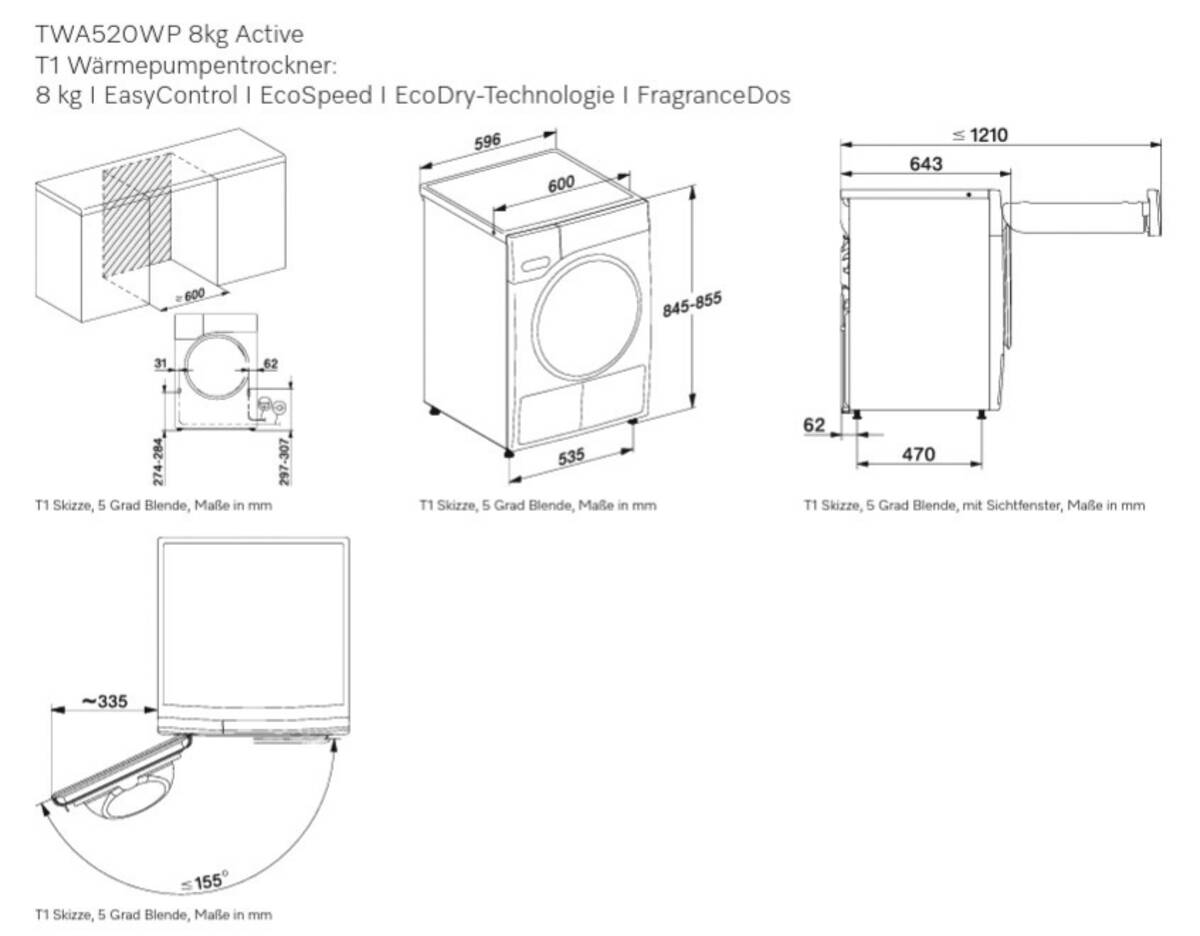 Wärmepumpentrockner, 5° geneigte Blende, 8 kg Füllmenge, Schontrommel, 12 Programme, Startzeitvorwahl, AddLoad (Nachlegefunktion), LCD-Display, Restzeitanzeige, EcoDry-Technologie, Eco, FraganceDos (duftende Wäsche mit optionalem Duftflakon), Imprägnieren, Knitterschutz, Schonen Plus, Finish Wolle, LED-Trommelinnenbeleuchtung, wartungsfreier Wärmetauscher (keine manuelle Reinigung mehr notwendig), Kondenswasserableitung, PIN-Code Verriegelung, Kondenswasser-Ablaufschlauch, Energieeffizienzklasse C, Breite: 59,6 cm, Höhe: 85 cm, Tiefe: 65,5 cm