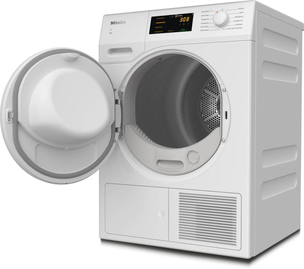 Wärmepumpentrockner, schräge Blende, 8 kg Füllmenge, Schontrommel, Startzeitvorwahl, AddLoad (Nachlegefunktion), Display, Restzeitanzeige, EcoDry-Technologie, FraganceDos (duftende Wäsche mit optionalem Duftflakon), Imprägnieren, Knitterschutz, PerfectDry (punktgenaue Trocknung dank Kalksensorik), Schonen Plus, Finish Wolle, LED-Trommelinnenbeleuchtung, wartungsfreier Wärmetauscher (keine manuelle Reinigung mehr notwendig), Kondenswasserableitung, PIN-Code Verriegelung, Energieeffizienzklasse D, Energieeffizienzklasse B, Geräuschemmissiosklasse B, Breite: 59,6 cm, Höhe: 85 cm, Tiefe: 64 cm