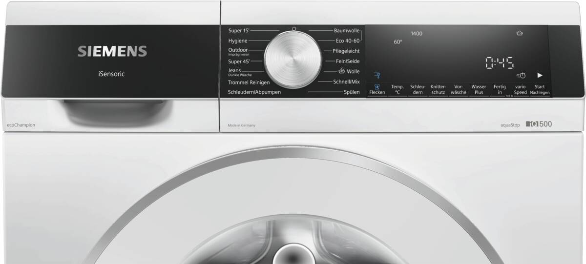 Waschmaschine, 9 kg Füllmenge, Schleuderdrehzahl U/min: maximal 1.400, Softtrommel, Touch-Control-Bedienung, Endzeitvorwahl, Nachlegefunktion, Pause-Funktion, LED-Display, Programmablaufanzeige, Restzeitanzeige, Flüssigwaschmitteleinsatz, WaterPerfect Plus (ressourcenschonendes Wassermanagement), Programme und Optionen Fein/Seide, Flecken, Hygiene, Outdoor/Imprägnieren, Trommelreinigung (mit Erinnerungsfunktion), Wolle/Handwäsche, LED-Trommelinnenbeleuchtung, IQdrive-Motor (bürstenlos, effizient, langlebig und leise), Aquastop, Energieeffizienzklasse A, Go Green Vertriebskennzeichen, Breite: 59,8 cm, Höhe: 84,8 cm, Tiefe: 59 cm