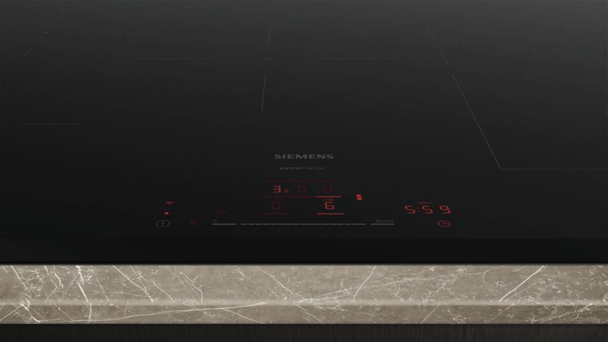 Glaskeramik-Kochfeld autark, Induktion, Bedienung vorne, touchSlider-Bedienung (Anwahl der Kochstufen ohne Knöpfe und Regler), Kochplatten: 5, Kombizonen: 1, nutzbar als zwei getrennte oder eine große Kochzone, 17 Leistungsstufen, Power Managment, Quickstart (Schnellstart), PowerBoost, Warmhaltefunktion, Pause-Funktion, ReStart (bei überkochen schaltet sich die Kochstelle automatisch ab und speichert die zuletzt gewählte Einstellung, die dann nach de r Reinigung bequem durch einen Fingerdruck wiederhergestellt werden kann), Timer, Facetten-Schliff, seitlich, Home Connect (Steuerung per Smartphone oder Tablets möglich), Breite: 80,2 cm, Höhe: 5,1 cm, Tiefe: 52,2 cm